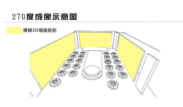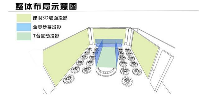 在宴會廳的實際應用中,又分為720度和360度投影。多以宴會廳墻體作為投影載體,結合4D動畫使宴會廳空間呈現動態的3D立體效果。立體成像在全息宴會廳中具有可變化性,可以根據不同的需求來變化不同的場景。