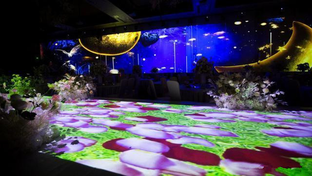 在宴會廳的應用當中主要是以互動T臺投影為常見。其利用了投影視覺效果,使得平常的T臺上投射出由光影組成的各種圖案,滿地的浪漫玫瑰、水中流動的魚兒、激情飛舞的蝴蝶、為愛盛開的百合、……,當進入畫面區域會隨著人體的運動產生并自動改變相應的效果。